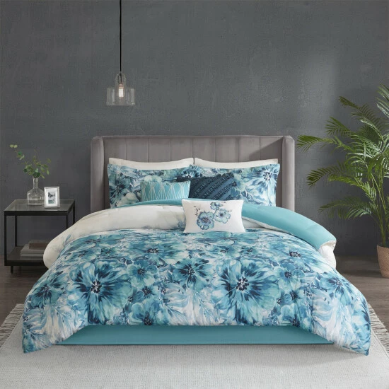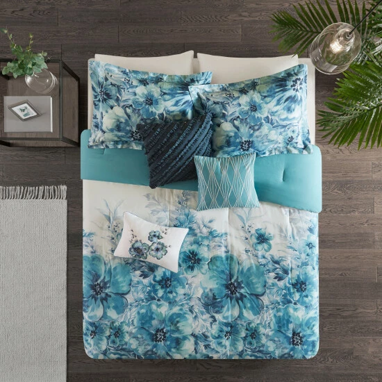Madison Parkโs Adella 7 Piece Cotton Printed Comforter Set introduces a beautiful splash of color to your bedroom. A floral watercolor print is gorgeously displayed on the 100-percent cotton percale comforter and shams, for a stunning casual allure. The solid reverse and bed skirt complement the top of the bed to create a chic coordinated look. Three decorative pillows with embroidered details and fabric manipulation add a charming accent to complete the bedding set. Sure to brighten up your bedroom, this bedding set is also OEKO-TEX certified, meaning it does not contain any harmful substances or chemicals to ensure quality comfort and wellness.