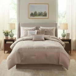 The Madison Park Atlas 7 Piece Jacquard Comforter Set offers a luxurious update to your bedroom. This jacquard comforter features an elegant medallion pattern on the taupe fabric with a soft microfiber reverse, creating a chic glam look. The 2 matching shams repeat the pattern of the comforter, while 3 decorative pillows with embroidery and pleated details add dimension to the top of the bed. A solid taupe bed skirt provides the finishing touch to complete this transitional comforter set. Machine washable for easy care, this comforter set has an antimicrobial treatment provides built-in freshness protection, inhibits growth of odor causing bacteria, and keeps the fabric newer, longer.
