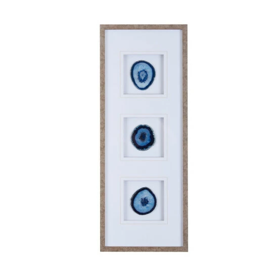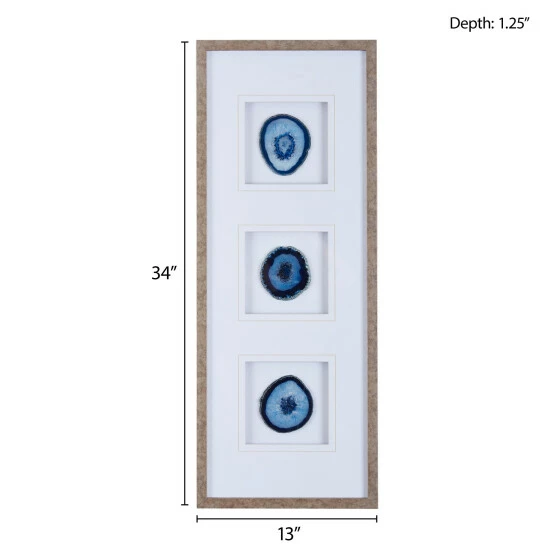 Deck out your walls with this standout piece of art. Blue Agate is a decorative display of a real 4-inch cut of a geode and framed under glass. Each cut is a one of a kind piece and distinct from each other. This will be a beautiful display on its own or it would look great as a set. As this unique piece uses 100-percent real agate stone, color variations may occur from the image due to the natural state of each agate stone. (Artist: Studio 5)