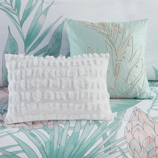 Create a serene atmosphere in your bedroom with the Madison Park Bonnet 8 Piece Cotton Printed Comforter Set. The white cotton comforter features a large botanical design in a soft and romantic color combination, for a shabby chic look. A solid aqua reverse complements the top of the comforter, while the hypoallergenic polyester filling provides exceptional comfort. The 2 matching shams also showcase a floral print and 2 aqua Euro shams add another splash of soft color. Also included are 2 decorative pillows with embroidered details and a solid aqua bed skirt that add the finishing touches to the botanical comforter set. This cotton bedding set is also OEKO-TEX certified, meaning it does not contain any harmful substances or chemicals to ensure quality comfort and wellness.