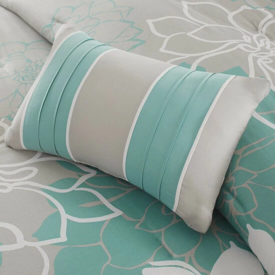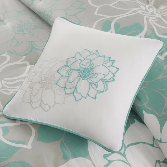The Madison Park Brianna Comforter Set brings beauty and grace to your bedroom. A large scale printed floral motif is displayed on the cotton sateen comforter and shams (1 for Twin/Twin XL Sizes) for a chic transitional look. Three decorative pillows with embroidered details and fabric manipulation add dimension to the top of the bed, while a solid bed skirt provides a clean finishing touch. This bedding set is also OEKO-TEX certified, meaning it does not contain any harmful substances or chemicals to ensure quality comfort and wellness. Items in the set may come in a rolled or compressed packaging, which will need to be fluffed up or steam ironed before use to remove wrinkles.
