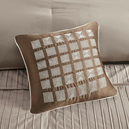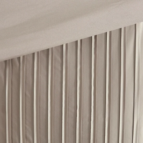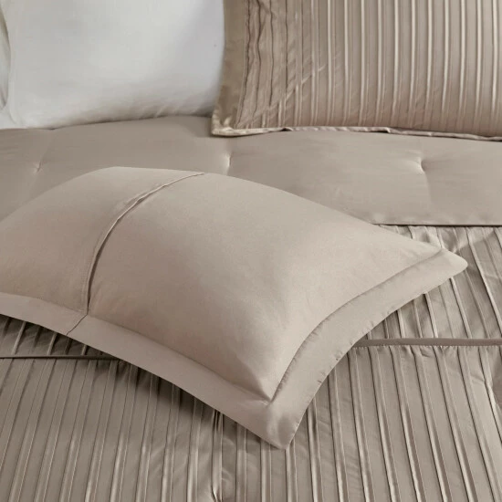 The Madison Park Channing Collection provides a modern look through fabric manipulation. This beautiful taupe polyester charmeuse gives a slight sheen to this bed while the small pleating on the bottom half of the bed and corresponding shams provides great dimension for your room. Three decorative pillows use embroidery and pleating to bring this beautiful collection together. Items in the set may come in a rolled or compressed packaging, which will need to be fluffed up or steam ironed before use to remove wrinkles.