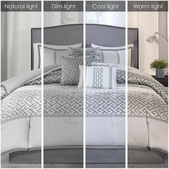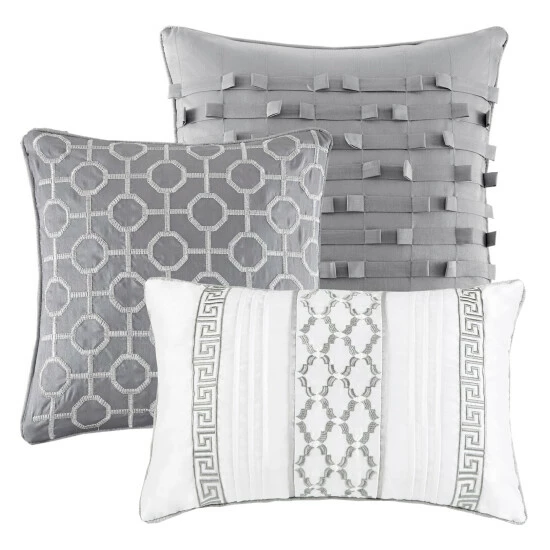 Upgrade your bedding with this upscale seven-piece comforter set from Madison Park. The poly jacquard face features an attractive geometric pattern with variations in each piece. Available in navy or grey on white, this bedding pairs well with nearly any decor style.
