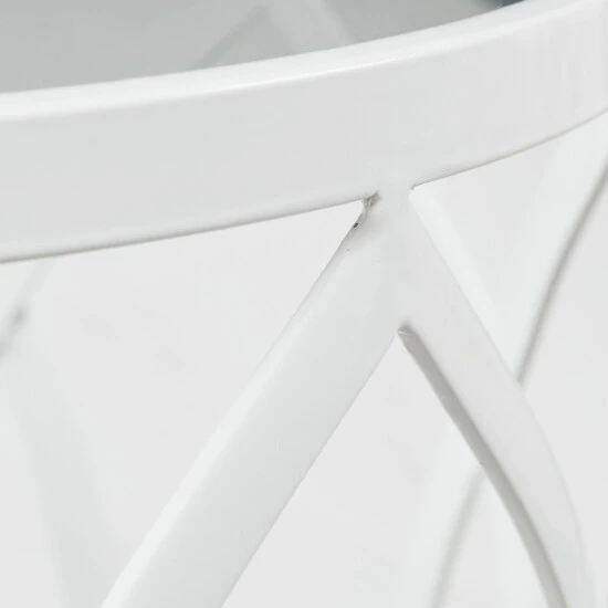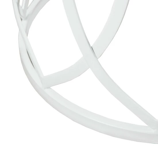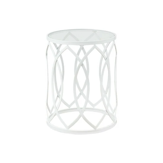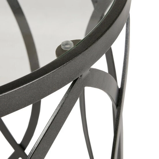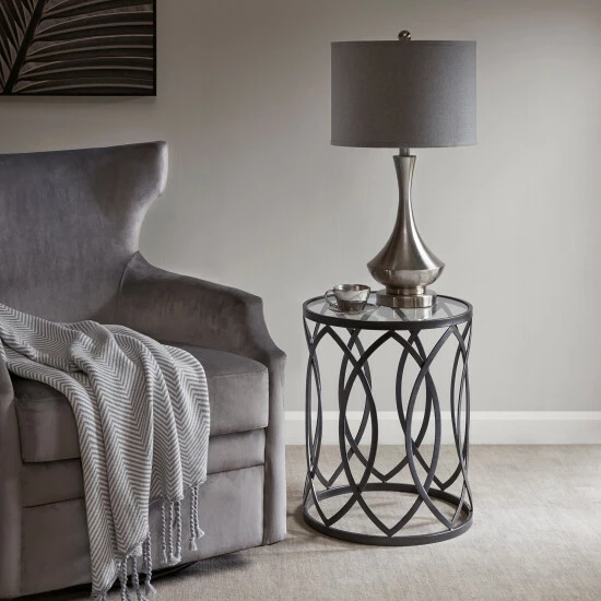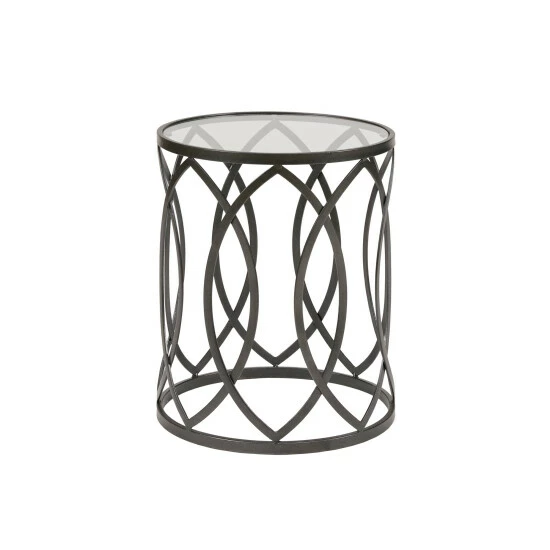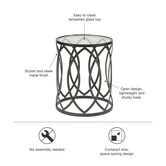 This striking, round metal accent table flaunts a geometric design with a crisp metallic finish for a clean, futuristic vibe. A clear, tempered glass top sits atop a singular geometric base, for the ideal juxtaposition of texture and color.