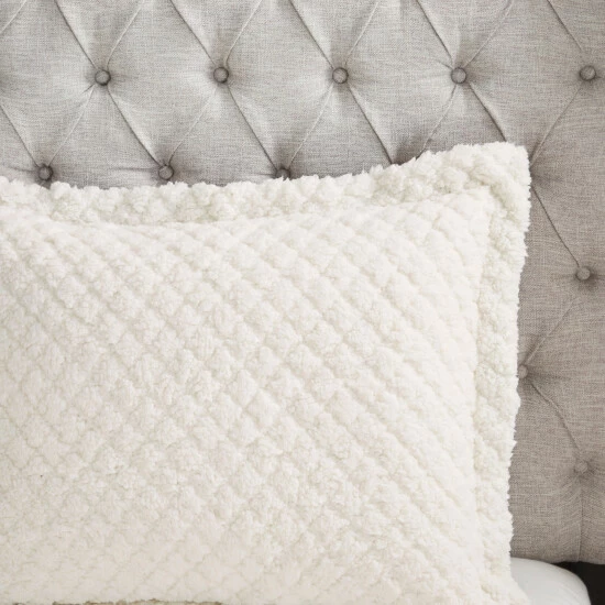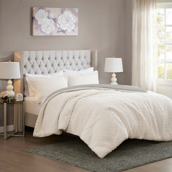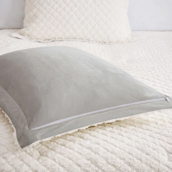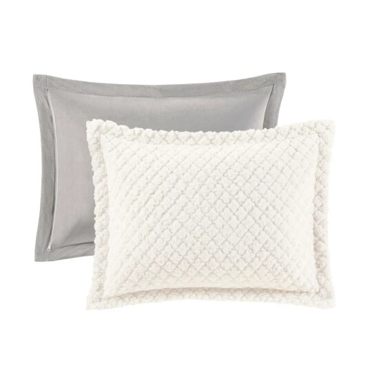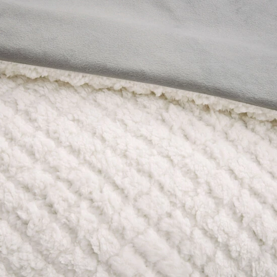 Sleep in pure comfort with the Madison Park Colden Reversible Textured Sherpa and Faux Mink Comforter Set. The cozy comforter features an embossed ivory sherpa fabric on the face with a soft grey faux mink on the reverse, creating incredible warmth and soft textured feel. The matching shams (1 for Twin Sizes) mirror the design of the comforter and have zipper closures to easily secure your pillows. Hypoallergenic polyester filling inside the comforter provides exceptional warmth and comfort. Machine washable for easy care, this reversible comforter set brings the perfect amount of cozy comfort and style to your bedroom decor. This comforter set is also OEKO-TEX certified, meaning it does not contain any harmful substances or chemicals to ensure quality comfort and wellness.