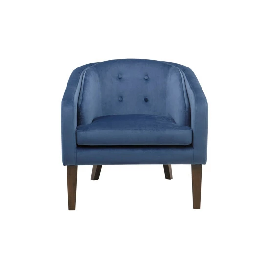 Introduce elegance and refined style to your home with the Cora Accent Chair by Madison Park. This lounge chair is upholstered in a soft, blue velvet fabric with tufted button accents on the rounded back, for a sophisticated modern look. The solid wood legs feature a dark coffee finish that complements the upholstery, creating a mid-century inspired aesthetic. Leg assembly is required.