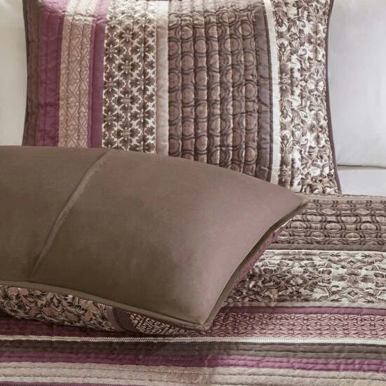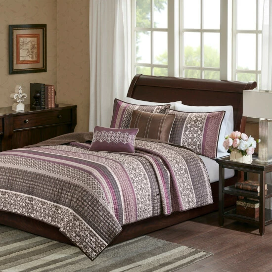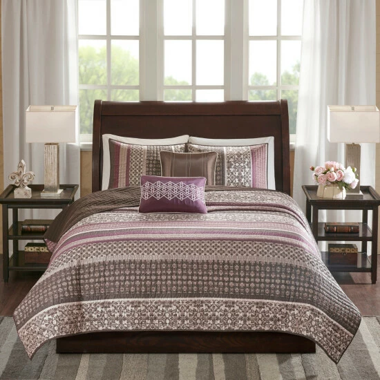- Creative color combination of brown, ivory and purple in the bedding ensemble
