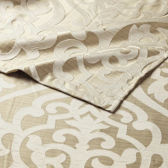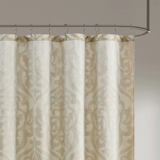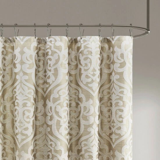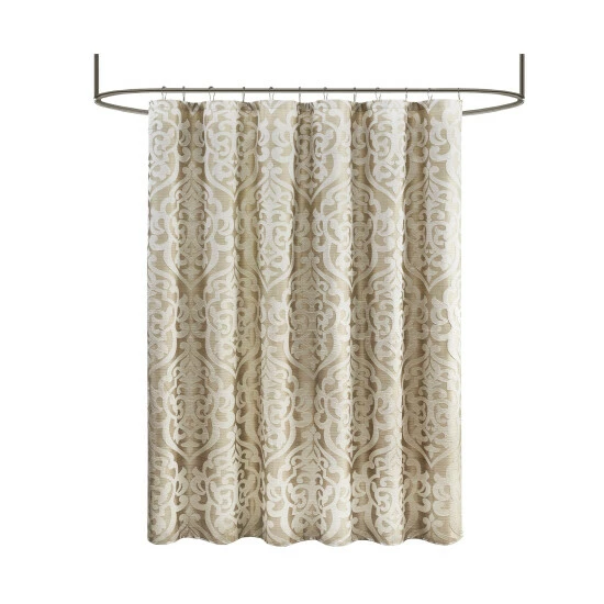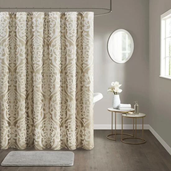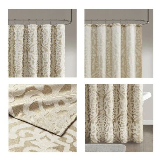Add a touch of class to your bathroom with our Madison Park Dillon Jacquard Shower Curtain. This luxurious textured shower curtain flaunts a gorgeous damask medallion design on a stria jacquard ground that adds rich texture and dimension to the lavish look. Measuring 72×72″, each shower curtain is finished with 12 button holes on top making it easy to assemble hooks and hang onto rod (hooks and rod not included). To better preserve this beautiful shower curtain, a water repellant liner is highly recommended and can be purchased separately (liner not included). complete the collection with coordinate matching bedding, also available and sold separately.