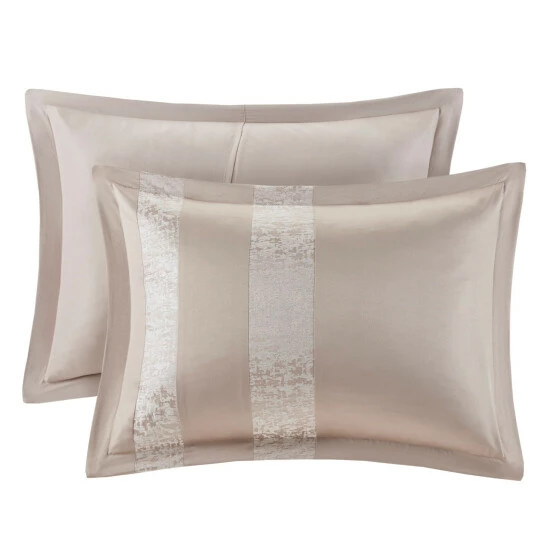 The Madison Park Elicia 7 Piece Chenille Jacquard Comforter Set offers a luxurious update to your bedroom dรฉcor. The luxurious taupe comforter and shams flaunt a pieced design with stripes of textured chenille jacquard that creates a stunning three dimensional effect. The 2 square decorative pillows and one oblong pillow are stuffed with hypoallergenic filling and feature embroidery and pleating details that provide elegant touches for the top of the bed. A solid taupe bed skirt completes the comforter set, giving the bed a clean finished look. Machine washable for easy care, this chenille jacquard comforter set is machine washable and brings a glamorous allure to your bedroom. Due to the nature of the chenille fabric, some shedding will occur naturally in the first 3-4 washes.