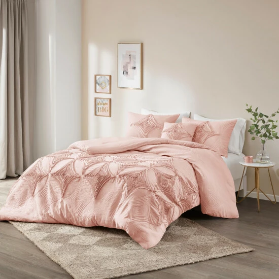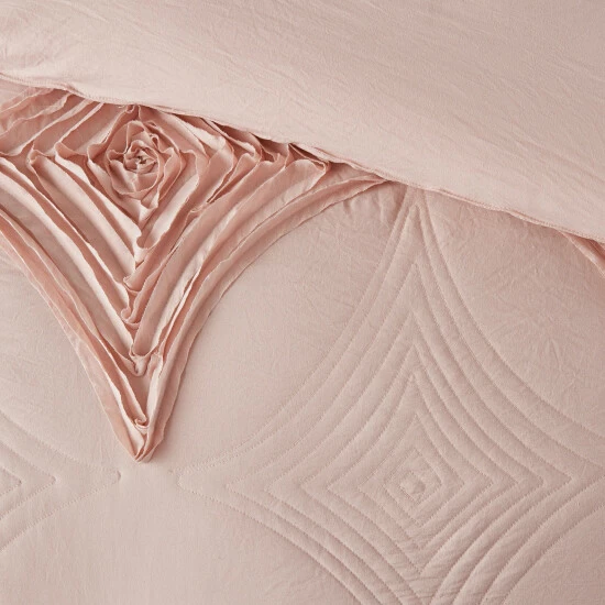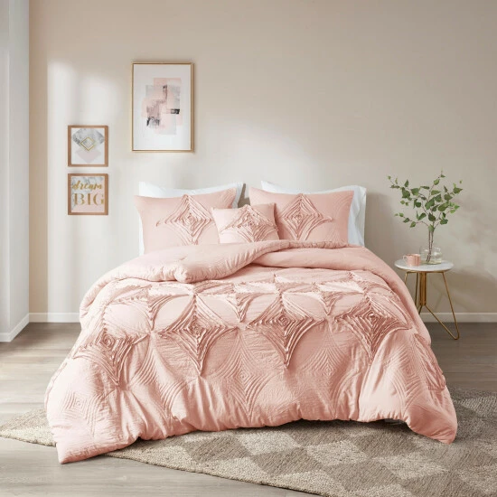 Create a relaxing vibe in your bedroom with the Madison Park Emiliana 4 Piece Comforter Set. The comforter flaunts an applique diamond design that adds dimension and a quilting diamond pattern to create a sophisticated shabby chic look. The 2 matching shams also feature a diamond applique touch to complement the comforter, while 1 coordinating decorative pillow completes the comforter set. Machine washable for easy care, this shabby chic comforter set adds a charming and casual update to your bedroom.