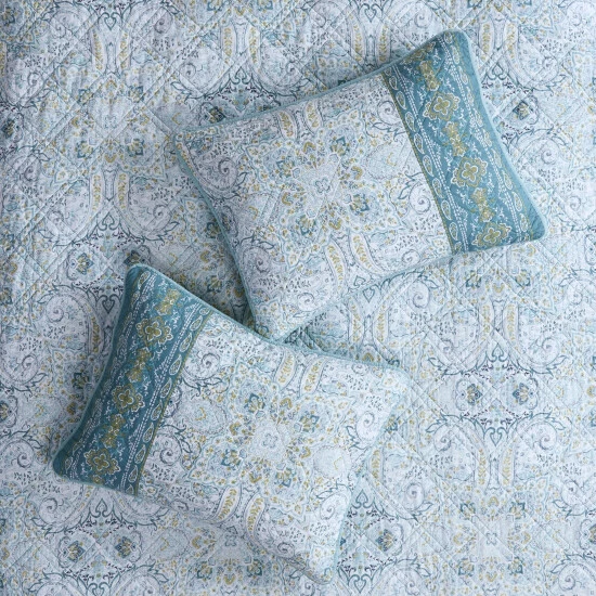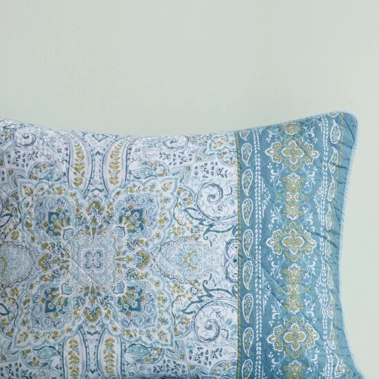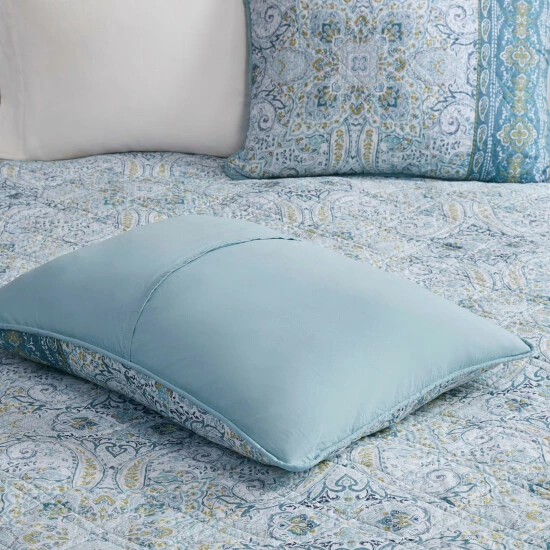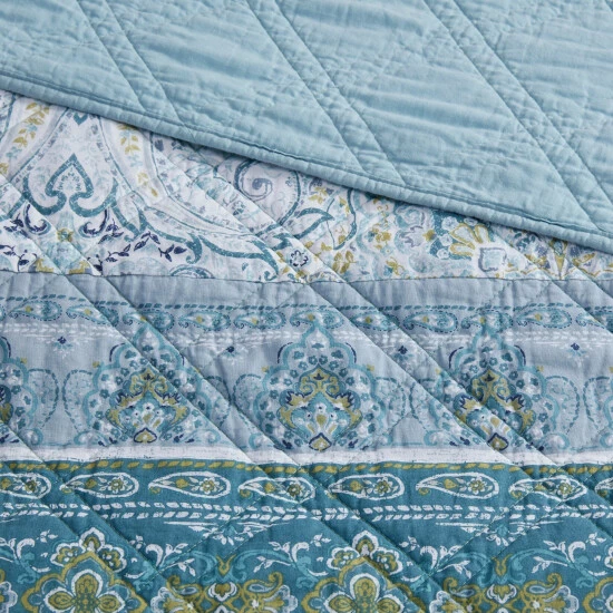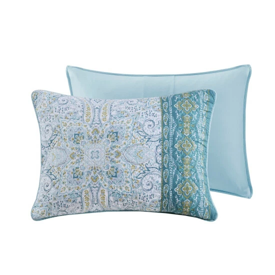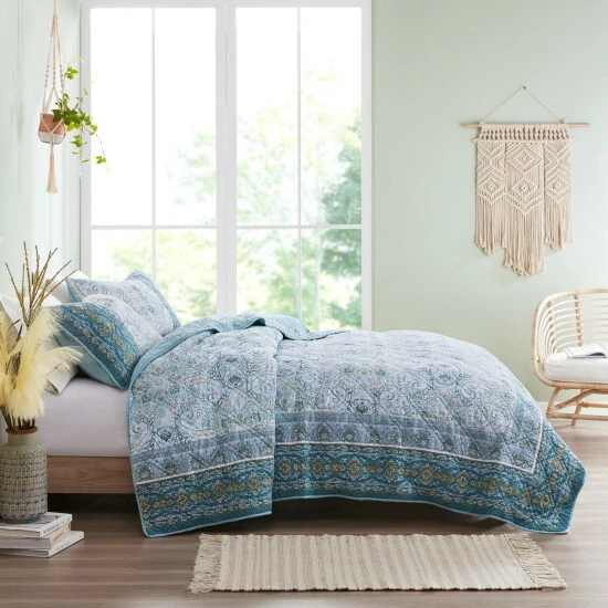 Dress your bed with the eclectic boho style of the Madison Park Gaia 3 Piece Reversible Cotton Coverlet Set. Flaunting a globally inspired medallion print, this cotton coverlet features a chic border design to accent the boho pattern on the face. A solid teal reverse complements the top of the reversible coverlet, while two matching shams complete the trendy transitional bedding set. Machine washable for easy care, this reversible cotton coverlet set has an antimicrobial treatment that provides built-in freshness protection, inhibits growth of odor causing bacteria, and keeps the fabric newer, longer.