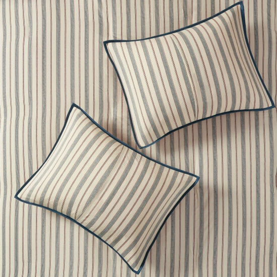 The Madison Park Georgia 9 Piece Cotton Twill Reversible Comforter Set offers a cozy cottage update to your bedroom. This cotton twill comforter features a floral motif in a classic color scheme that flips to a complimentary striped pattern on the reverse. Two coordinating shams flaunt the same pattern as the comforter, while two Euro shams add a touch of color to the comforter set. Three decorative pillows with embroidery and fabric manipulation and a solid bed skirt complete this country comforter set. This bedding set is also OEKO-TEX certified, meaning it does not contain any harmful substances or chemicals to ensure quality comfort and wellness.