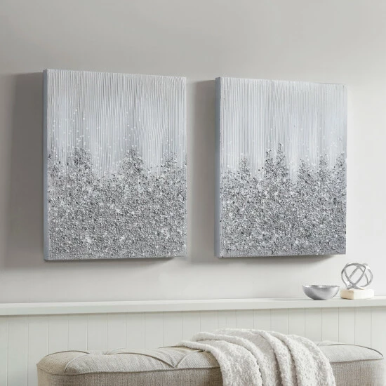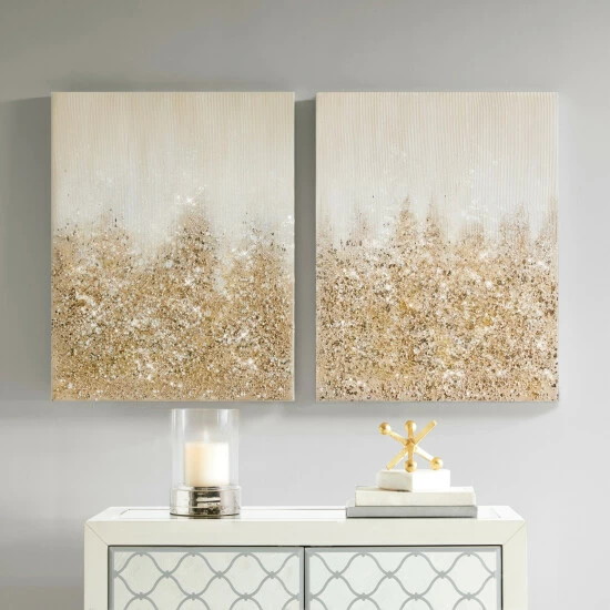The Glimmer Hand Embellished Canvas 2 Piece Set brings a touch of glam to your home decor. This 2 piece canvas wall art set features a gradient abstract design in metallic hues for a striking modern look. 100-percent hand-brushed with real rock and stone embellishments add texture and dimension, while the metal glitter finish adds a beautiful sheen and luster. Each piece is finished with a cardboard backing for additional structure and 2 D-rings on the reverse making it easy to hang. Give your home a luxurious update by adding the perfect amount of sparkle, with our Glimmer Art Piece Set. Due to hand embellishment of natural rock and stone; colors and glitz may vary slightly from image making each piece unique. Spot clean only; this set includes two pieces with each piece measuring 22×28 inches.