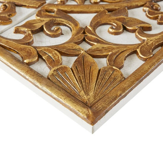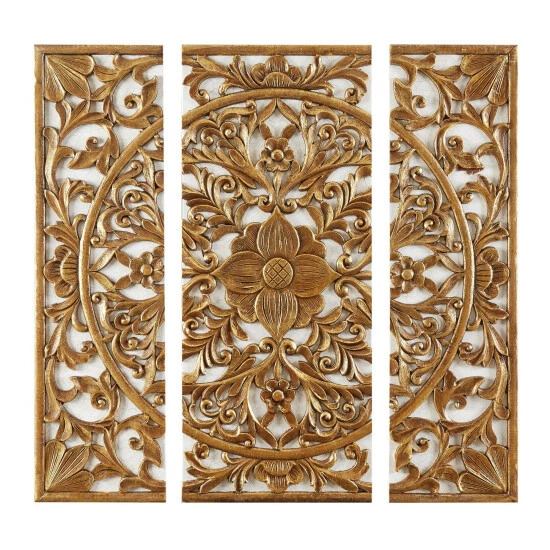 The Madison Park Gold Medallion 3D Embellished Canvas 3 Piece Set brings a touch of elegance to your home decor. This wall decor flaunts an intricate 3D embellished medallion design, in a gold hue, for a beautiful globally inspired look. Crafted from resin, canvas, and Fir wood, this gorgeous canvas 3 piece wall art set is easy to hang together or separately to give your home a stunning elegant flair.