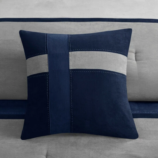 The Madison Park 7 Piece Hanover Comforter Set offers you a casual alternative in fashion bedding. The reverse of the comforter is solid Blue. The soft microsuede in heather grey, Blue and charcoal grey is pieced together to create this beautiful bed. The decorative pillows are embroidered and pieced to add a decorative element to this simple, yet beautiful bedding collection. With hypoallergenic filling in the comforter and pillows, this stylish comforter set easily refreshes your bedroom decor and is machine washable for easy care.
