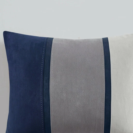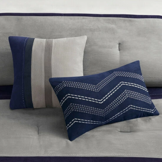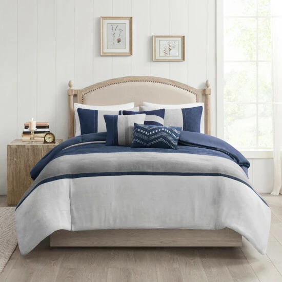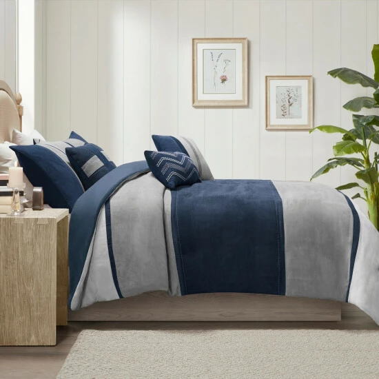 The Madison Park 6 Piece Hanover Duvet Cover Set offers you a casual alternative in fashion bedding. The reverse of the duvet cover is solid blue. The soft microsuede in heather grey, blue and charcoal grey is pieced together to create this beautiful bed. The decorative pillows are embroidered and pieced to add a decorative element to this simple, yet beautiful bedding collection. This duvet cover set is machine washable for easy care. Button closures help secure a comforter insert within the duvet cover and four inside ties in the corners help prevent it from shifting (insert is NOT included). Items in the set may come in a rolled or compressed packaging, which will need to be fluffed up or steam ironed before use to remove wrinkles.