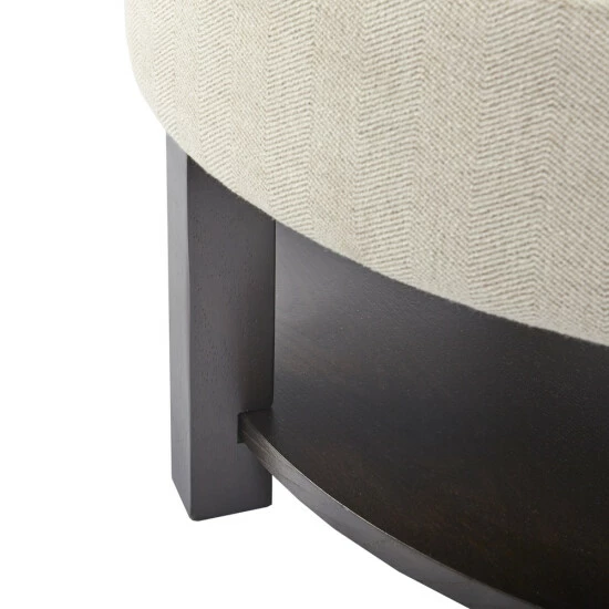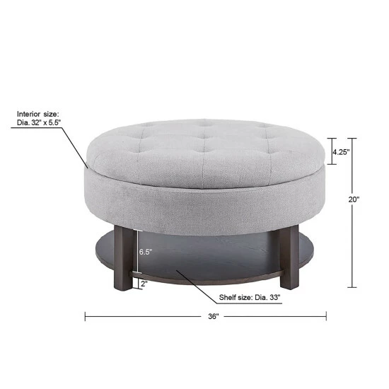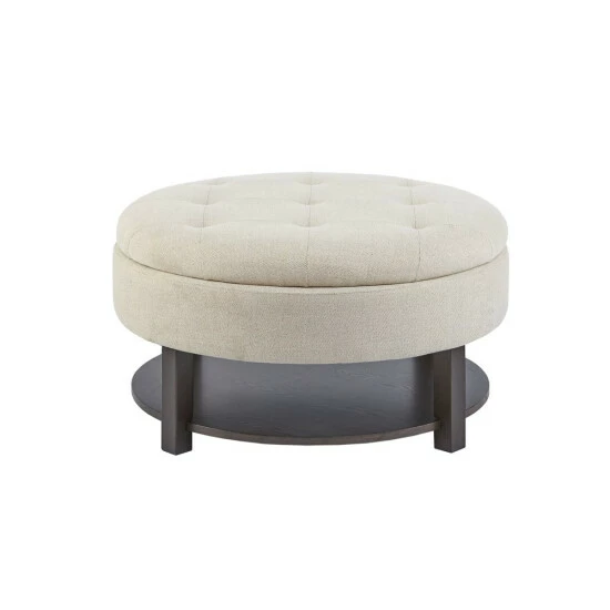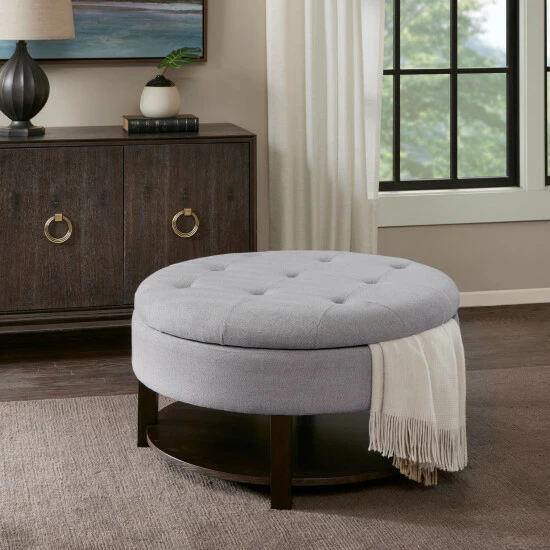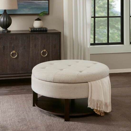 Don’t sacrifice style for storage with the Madison Park Javier Round Storage Ottoman. The round storage ottoman features a upholstered tufted top that opens to reveal ample storage space. A lower veneer shelf provides storage for magazines and newspapers. Incorporate this round ottoman to your home to centralize the clutter and add a stylish touch to your living room. Removable cushion, not reversible. Leg assembly required, tools included.
