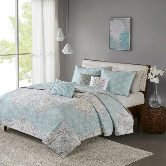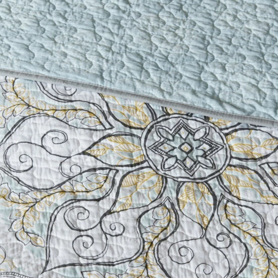 Freshen up your bedroom decor with this lovely coverlet set, including quilt, shams, and decorative pillows. Featuring a medallion design in blues, whites, and greys on one side, and an all-over quilted blue on the other, the reversible coverlet offers versatile looks for your bed. The cotton sateen material lends a smooth, natural softness to your sleeping space.