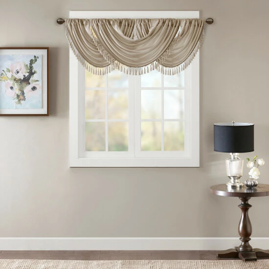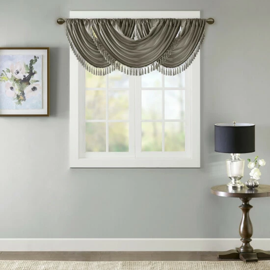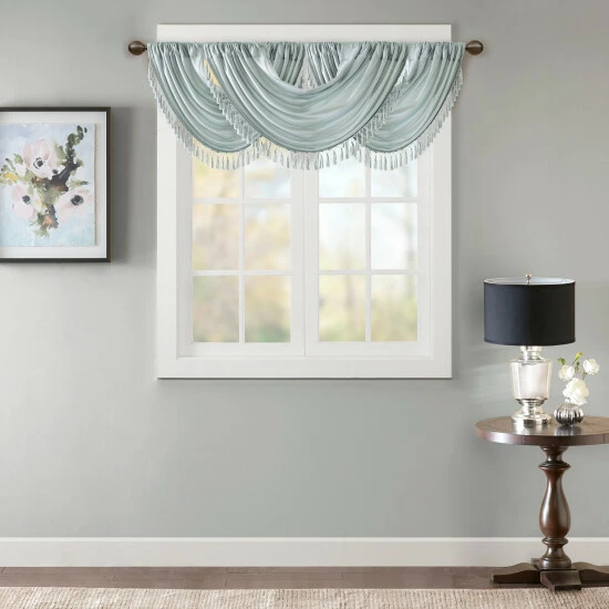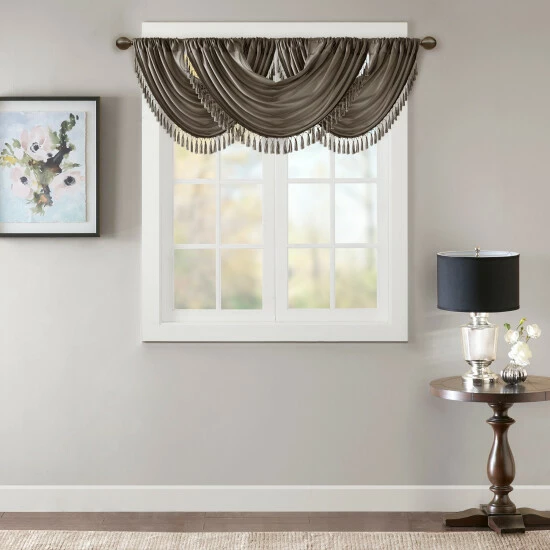 Bring style and sophistication to your windows, with our Juline Waterfall window valance. This classy colorful valance showcases rich center draping details and a beautiful tassel trim, combined with the faux silk fabric for a rich sheen and stylish update. Features added lining and a rod pocket top finish; fits up to 1.25 inches diameter rod. Part of our decorative valance collection, this valance is perfect as a stylish addition to any small window or even better as a layering piece to dress up any window panel. This window valance is also OEKO-TEX certified, meaning it does not contain any harmful substances or chemicals, ensuring quality comfort and wellness. ย Need to purchase 3 valances to create same look as image.ย