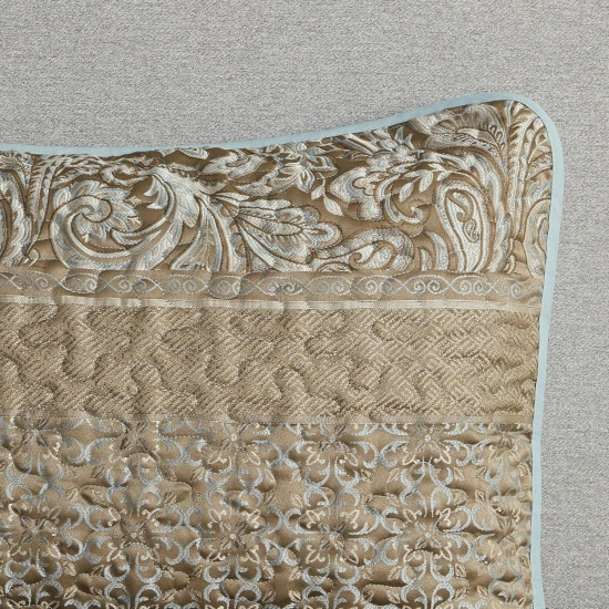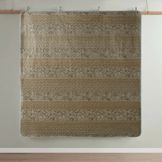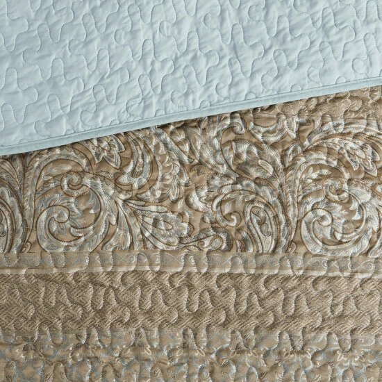 The Madison Park Laura 3 Piece Reversible Jacquard Coverlet Set offers a refined update to your bedroom. This reversible quilted coverlet features a striped motif with a paisley print and a solid blue reverse to create a luxurious traditional look. The 2 matching shams repeat design of the coverlet to complete the bedding set. Perfect for use in the summer or as an added layer of warmth in the winter, the jacquard coverlet brings relaxing comfort to your space. Machine washable for easy care, this luxurious jacquard coverlet set has an antimicrobial treatment that provides built-in freshness protection, inhibits growth of odor causing bacteria, and keeps the fabric newer, longer.