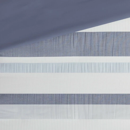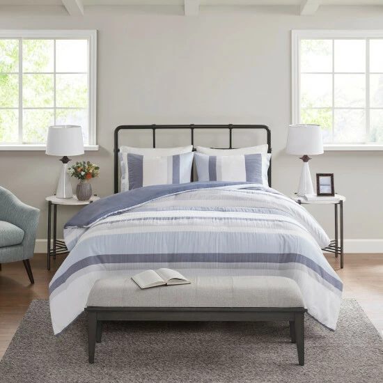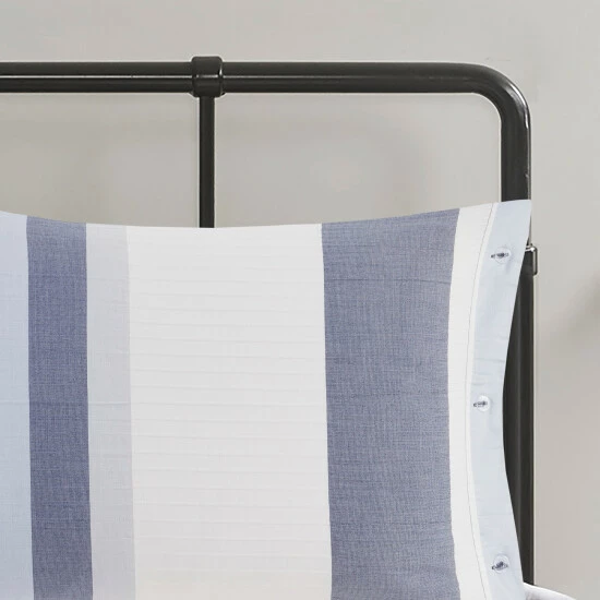 Refresh your bedroom with the casual charm of Madison Park’s Levi 3 Piece Jacquard Duvet Cover Set. The jacquard duvet cover features a striped design for an updated casual look. The matching shams pair handsomely with the duvet cover to complete the farmhouse-inspired bedding set. Machine washable for easy care, this jacquard duvet cover set has an antimicrobial treatment that provides built-in freshness protection, inhibits growth of odor causing bacteria, and keeps the fabric newer, longer. A button closure at the foot end secures a padded insert within the duvet cover and inside corner ties prevent it from shifting (insert is NOT included). Bedding may come in rolled or compressed packing and will need to be fluffed up. Use a steam iron to help remove wrinkles easier.ย