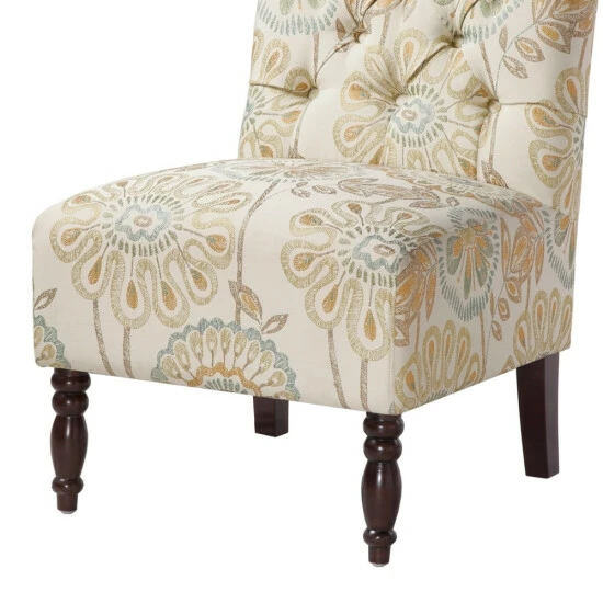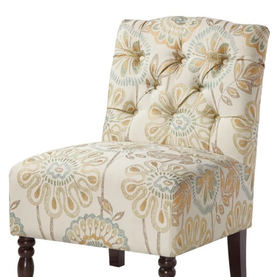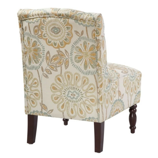This slipper chair is a great way to simultaneously add extra seating and style to your space. This chair is available in multiple color options, and features a thick, comfy seat cushion and tufted backrest. The turned, solid wood legs complete the transitional look.