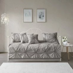Grace your bedroom with the beauty and comfort of the Madison Park Lorilyn 6-piece Daybed Cover Set. The gorgeous dark grey daybed cover flaunts tufting and ruche detailing in a puckered diamond design, for a charming textural look. Three matching shams mirror the top of the daybed coordinating beautifully with the rest of the ensemble. An embroidered decorative pillow adds a stunning accent, while a solid bed skirt provides a clean finish to complete the bedding set. Displaying a yarn dye look, this tufted daybed cover set brings grace and elegance to your guest bedroom decor.