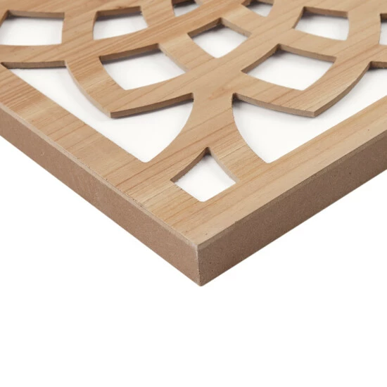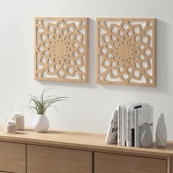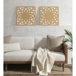 Add a global artistic touch to your home with the Madison Park Lotus Medallion Wood Wall Decor 2 Piece Set by Artist Emily Warne. Each square wall decor features a laser cut floral medallion design in a distressed natural wood color on a white base ground, creating great contrast for an intricate and eye-catching lotus design. The light MDF material makes it simple and easy to hang, while a Sawtooth fixture on the reverse of each piece allows you to add any amount of breath in between to fit any size wall or space. Comes as a two piece set, each piece measuring 20×20 inches and spot clean only.
