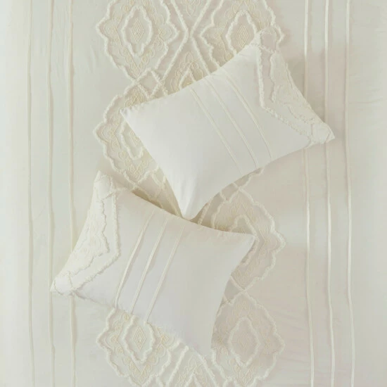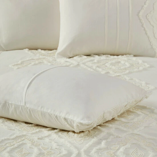 Bring a cozy shabby chic style to your bedroom with the Madison Park Luna 3 Piece Cotton Comforter Set. This 100-percent cotton comforter flaunts a chenille and embroidered geometric pattern on the fabric, creating a charming farmhouse look. The 2 matching shams repeat the design of the comforter to complete the shabby chic comforter set. Hypoallergenic polyester filling, in the comforter, provides excellent warmth and comfort. Machine washable for easy care, this cotton comforter set offers a graceful update to your bedroom decor. Items in the set may come in a rolled or compressed packaging, which will need to be fluffed up or steam ironed before use to remove wrinkles.