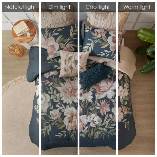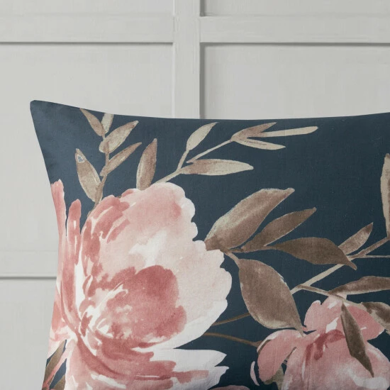 Breathe fresh life and color to your bedroom with this stunning comforter set from Madison Park. The comforter and matching shams feature an oversized floral pattern in pink and green hues on a solid navy-blue background for an eye-catching look. Solid blush Euro shams and a matching bedskirt complete the set.