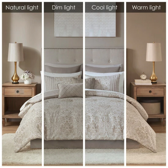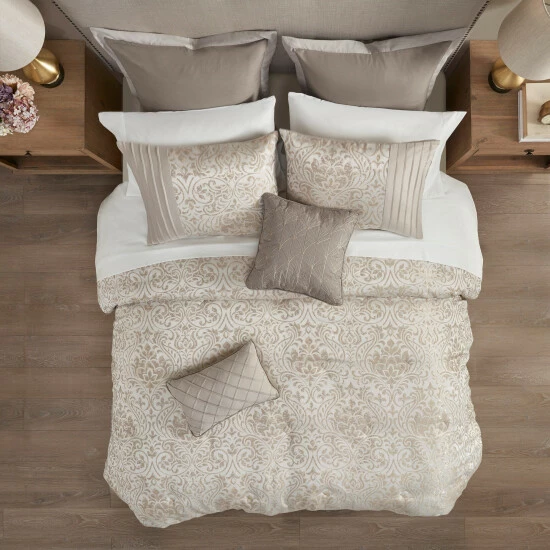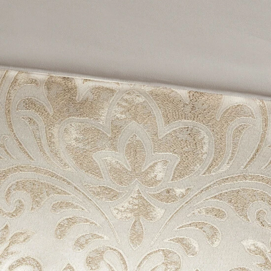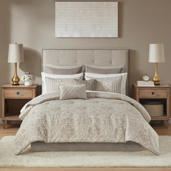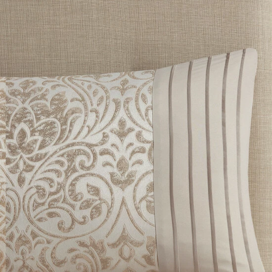 Transform your bedroom with the traditional style of the Madison Park Maisie 12 Piece Jacquard Comforter Set. The jacquard comforter and shams feature gold metallic thread woven into the all-over damask pattern, for a sophisticated look. Pleating details on the shams add dimension to the comforter set. Two coordinating Euro shams and a solid khaki bed skirt complement the jacquard comforter, while two decorative pillows add the finishing touches. Also included is a complete egg-shell white microfiber sheet set that adds a soft touch to the comforter set.