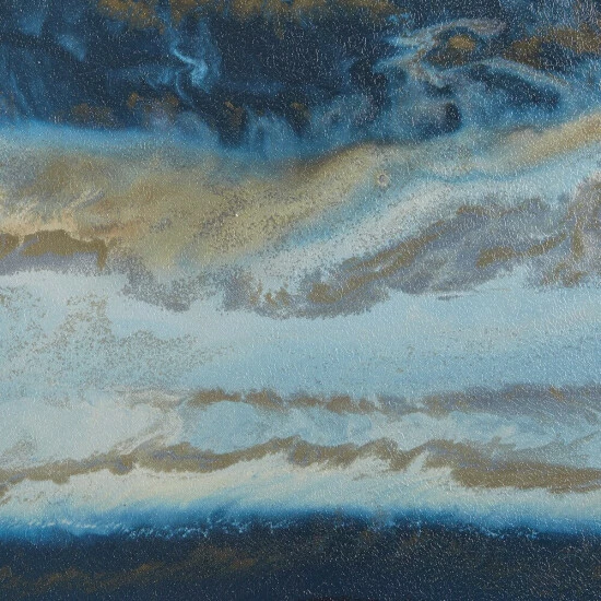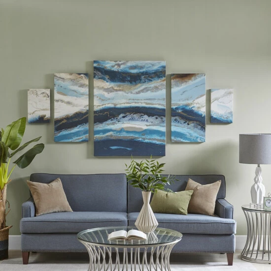 Give your home a beautiful modern touch with the Madison Park Midnight Tide Blue Gel Coat Canvas 5 Piece Set. Showcasing cool blues and earthy tones, this oversized five piece wall art set creates a gorgeous abstract image that can serve as the focal point in any room. The contrasting colors are protected by a gel coating that provides a glossy finish and protects them from fading. A cardboard backing on each canvas adds structure and support. Hang this gel coat canvas set together or separately to complement your living room or bedroom decor.