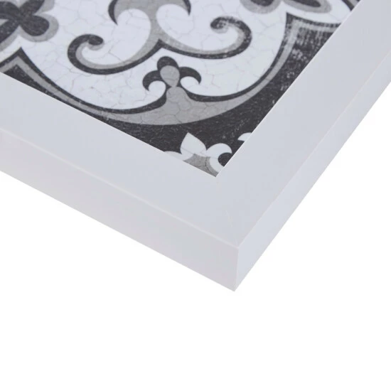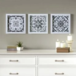 The Madison Park Montage Printed Distressed Tile Pattern 3 Piece Deco Box Wall Art Set by Artist Doug Hernandez, brings a bold and stylish touch to your home decor. Each deco box features an intricate medallion design in black and white hues, for a striking and contrasting update. A gel coat finish is added to the distressed paper ground for a rich texture and light glossy finish, while the white frame provides the finishing touch for a neat shadowbox effect. A Sawtooth is featured on reverse of each piece making this set easy to hang; simply assemble the pieces together horizontally or vertically to fit any space or hang pieces separately for a more stylized approach. Spot clean only with each piece measuring 14×14 inches, this 3 piece set is perfect to add some style and pattern to any entry way, kitchen space, or bathroom.