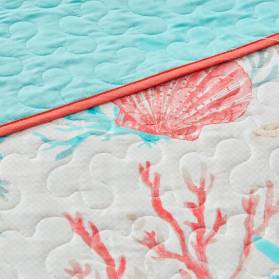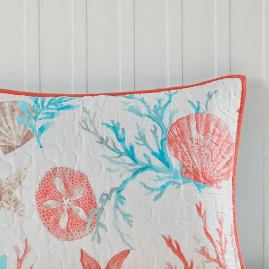 For a vibrant coastal update to your bedroom, the Madison Park Pacfic Grove 6 Piece Cotton Sateen Coverlet Set is perfect for you! This cotton coverlet and shams feature a starfish and coral motif in vivid colors to brighten your space. The solid reverse adds a splash of color to complement the coastal design. Three decorative pillows with embroidery and fabric manipulation add the finishing touches to the coverlet set. This bedding set is also OEKO-TEX certified, meaning it does not contain any harmful substances or chemicals to ensure quality comfort and wellness.