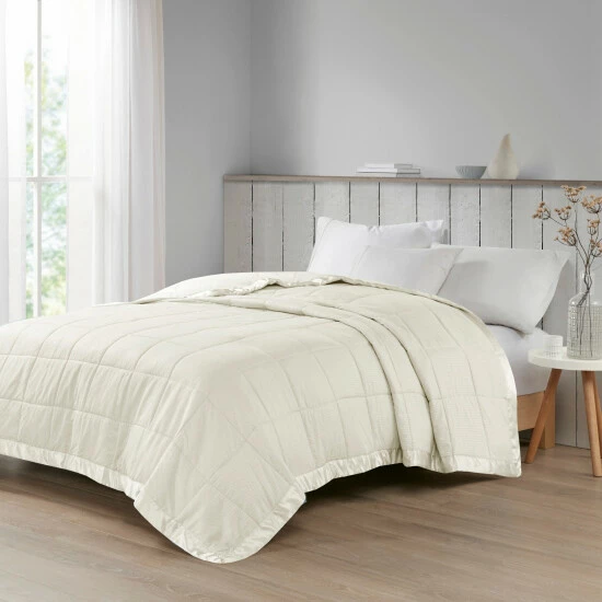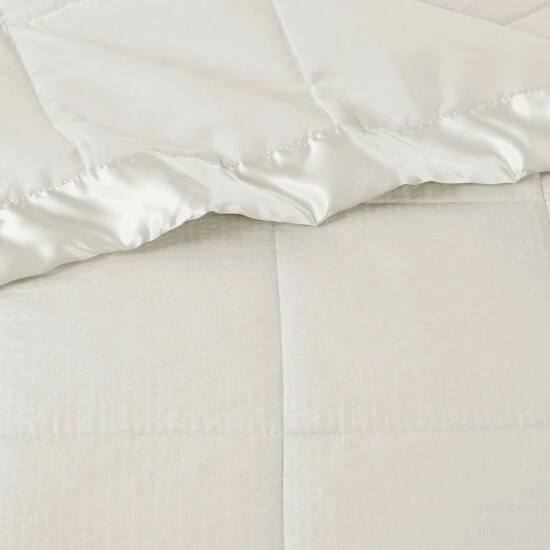 Make every night a cozy one with this textured oversized down alternative blanket. The color-matched 3″ satin trim adds a luxury element that feels great on your skin. It features a 3M Scotchgard Moisture Management Treatment that wicks away moisture while helping release stains. Machine washable for easy care with a classic box quilting design. This hypoallergenic blanket is also OEKO-TEX certified, meaning it does not contain any harmful substances or chemicals, ensuring quality comfort and wellness.