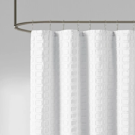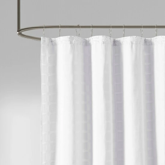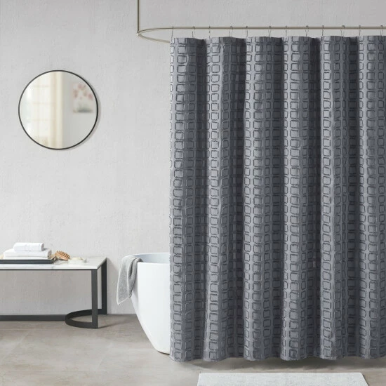Distinguish your contemporary bathroom theme with this Quade shower curtain from Madison Park. Flaunting a solid color, this shower curtain boasts subtle appeal and allows easy coordination with your existing bathroom decor pieces. The square geometric design featuring a clipped treatment adds depth and dimension to this solid-tone shower curtain. Experience simple care thanks to the machine-washable 100-percent polyester construction, which is strong enough to withstand daily use. Several neutral and cool colors are available to complement bold or understated bathroom palettes.