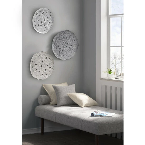 Line your walls with our Madison Park Feather Iron Painted Wall Decor 3 Piece Set. Painted with beautiful colorful hued iron finish, this wall decor set offers soft neutral and metallic touches to any room. The feather cutout design is made of a 100-percent metal material and features attached hook rings on each piece to easily mount on your wall. Available in a set of three, this alternative metal wall decor can be hung together to bring life to any bare wall or hang separately for a little pop throughout your room or home.