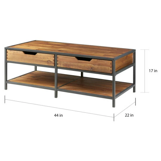 An attractive blend of minimalist lines and rustic style, this beautiful coffee table will fit with a variety of decors. The table is crafted from rough-hewn, acacia wood planks, supported by a gunmetal finish metal frame. Two drawers and a lower shelf offer plenty of storage space for remotes, magazines, and other essentials, adding extra practicality to this beautiful coffee table.