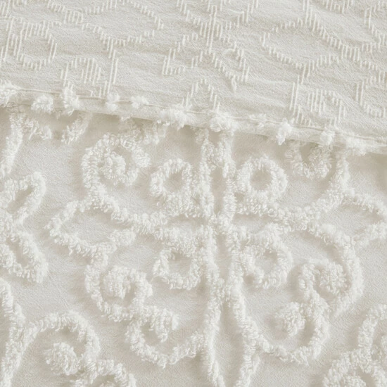 Give your bedroom a cozy shabby chic look with the Madison Park Sarah 3 Piece Tufted Cotton Chenille Bedspread Set. The cotton chenille bedspread and shams flaunt a tufted floral medallion motif, creating a charming farmhouse look. This oversized bedspread is also unfilled for lightweight coverage and is perfect for summer use or as an added layer for the cold season. Made with a 100-percent cotton face and reverse, this tufted cotton bedspread set offers a shabby chic update for your bedroom. This bedding set is also OEKO-TEX certified, meaning it does not contain any harmful substances or chemicals to ensure quality comfort and wellness. Due to the nature of the chenille fabric, some shedding will occur naturally in the first 3-4 washes.