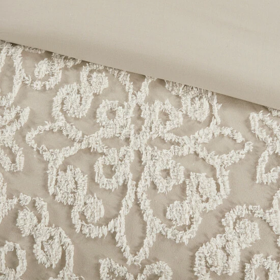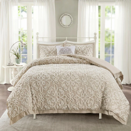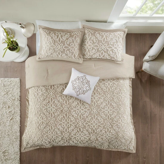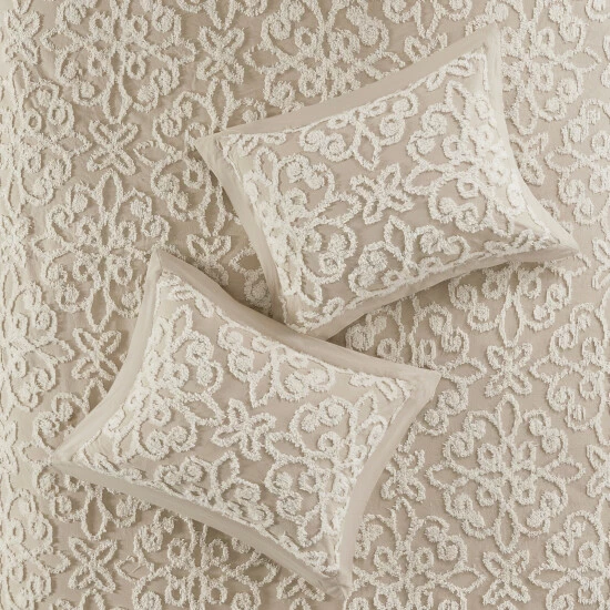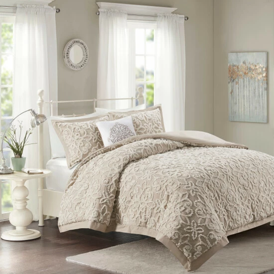Give your bedroom a cozy shabby chic look with the Madison Park Sabrina 4 Piece Tufted Chenille Comforter Set. The cotton chenille comforter and 2 shams flaunt a tufted floral medallion motif, creating a charming farmhouse look. A square decorative pillow adds a rich, textural touch to complete the comforter set. Made with a 100-percent cotton face and reverse, this tufted chenille comforter set offers a shabby chic update for your bedroom. This bedding set is also OEKO-TEX certified, meaning it does not contain any harmful substances or chemicals to ensure quality comfort and wellness. Due to the nature of the chenille fabric, some shedding will occur naturally in the first 3-4 washes.