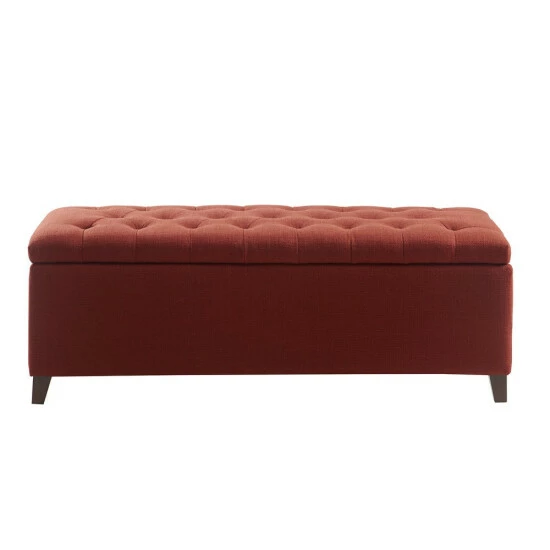 This modern storage ottoman accentuated with button tufting provides ample storage and features an elegant rust red fabric with rich espresso legs. Leg assembly required.