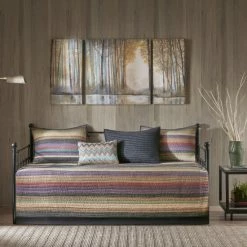 Remake your guest room with this Madison Park daybed set. The 100-percent microfiber material has a smooth and soft feel, and the blue, purple, and red hues add a sophisticated pop of color. The daybed set is machine washable for simple cleaning and includes a black bedskirt that pulls the design together.
