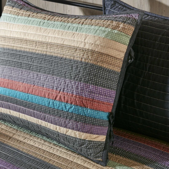 - Features: Printed/ Reversible shams/ Lodge inspired stripe/ 15 inches bedskirt drop/ Channel quilting