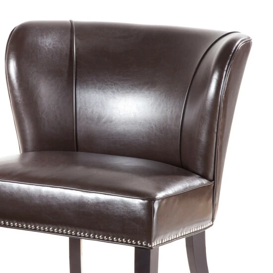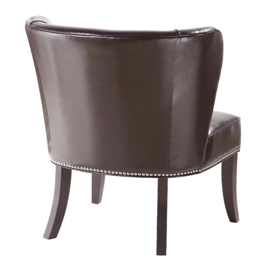 The Madison Park Sheldon Armless Accent Chair introduces a bold, modern update to elevate a classic design. Flaunting an armless wingback design, this accent chair features individually placed silver nail heads to create an elegant trim on the faux leather upholstery. High-density foam filling offers and solid wood frame provides exceptional comfort and support. The solid wood legs showcase a dark finish that creates a beautiful contrast with the faux leather upholstery, for an eye-catching look. Sleek and stylish, this armless accent chair adds character and unique style to your living room. Leg assembly is required.