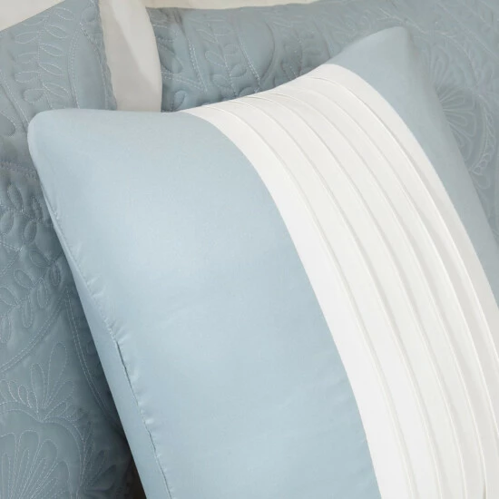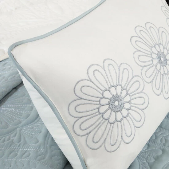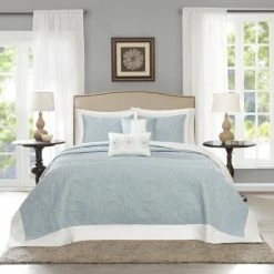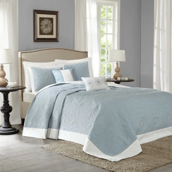 Add color to your traditional space with the Madison Park Stanton Bedspread Set. The soft color hue is accented with large quilting in a medallion pattern, while a large ivory border makes a statement on your bedding. Two decorative pillows complete this collection with embroidery and fabric manipulation ion corresponding colors to the top of bed.ย