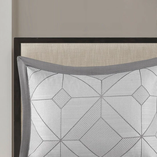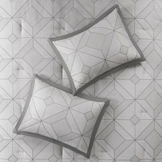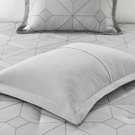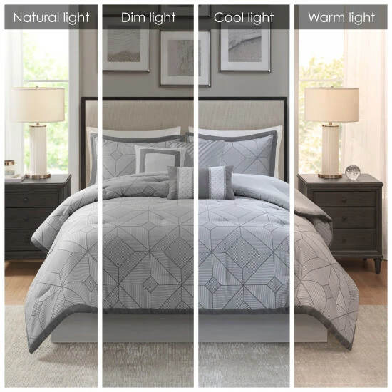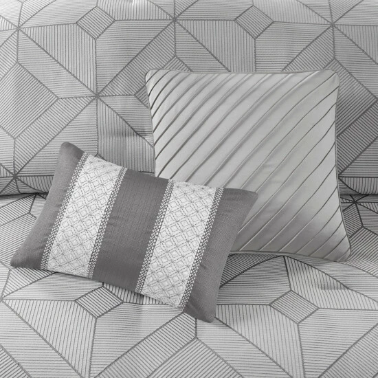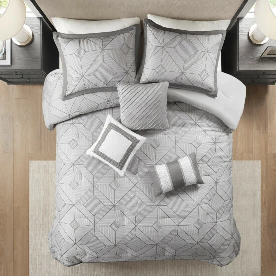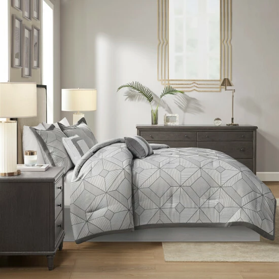Madison Park’s Tatum 7 Piece Jacquard Comforter Set offers a refined and sophisticated update to your bedroom. This jacquard comforter features gray geometric designs with a soft microfiber reverse that adds comfort, for a chic luxurious look. The two matching shams also showcase a geometric pattern to complement the transitional style comforter. Also included are three decorative pillows and a solid gray bed skirt that add the finishing touches to complete the glam bedding set. Hypoallergenic polyester filling in the comforter and pillows provide exceptional warmth and comfort. Machine washable for easy care, this jacquard comforter set brings an elevated touch to your bedroom decor.
