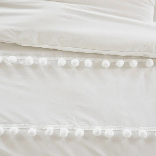 The Madison Park Tracie 3 Piece Pom Pom Duvet Cover Set offers a simple chic update to your bedroom decor. Made from 100-percent cotton, the face of this ivory duvet cover features stripes of pompoms that add texture and dimension for a boho inspired look. The matching cotton shams flaunts a pompom trim to complement the top of the bed. Machine washable for easy care, this pompom duvet cover set gives your bed a casual yet chic style to turn your bedroom into a relaxing space. Button closures help secure a comforter insert within the duvet cover and four inside ties in the corners help prevent it from shifting (insert is NOT included).