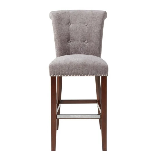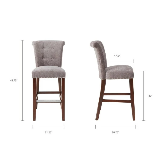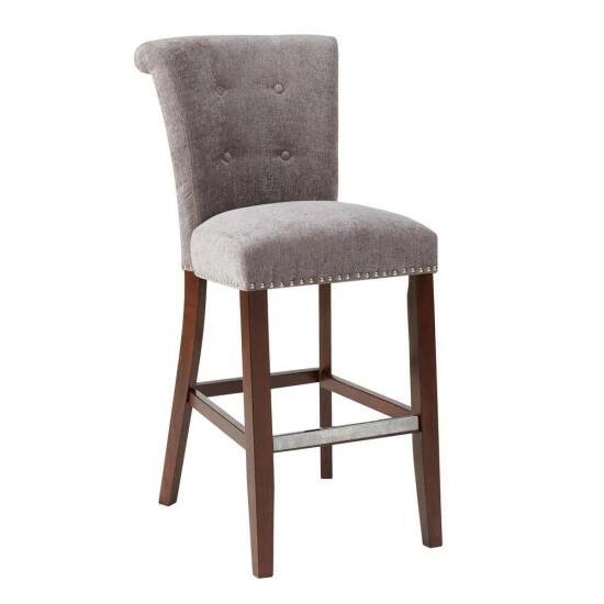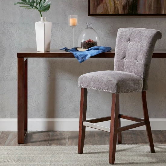 Elegant silver nail heads add an extra touch of dignified style to this roll back button tufted bar stool.