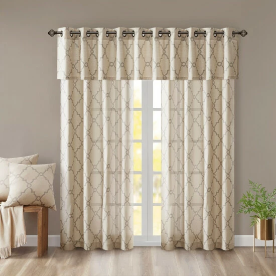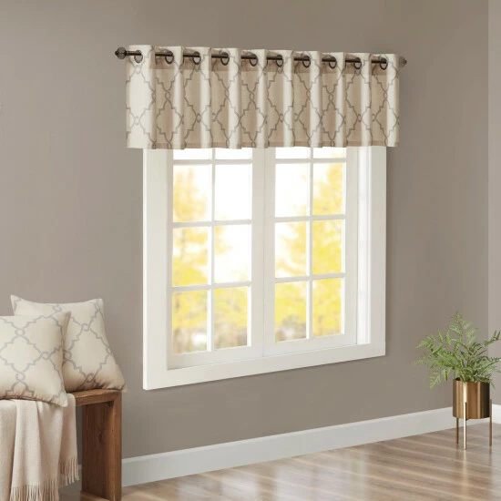 Lend a pop of color and texture to your home with the utter charm of this valance. This valance features a trendy soft fretwork on a light colorful ground, creating a simple yet modern look. The cotton blend basket weave fabric softly filters the perfect amount of sunlight into your home, while providing texture for natural appeal.