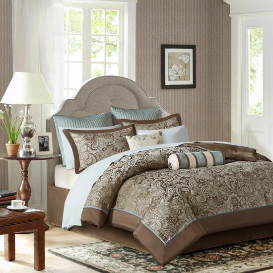 Transform your bedroom into a luxurious chamber with this cozy Madison Park Whitman blue comforter and cotton sheet set. Featuring a beautiful paisley pattern woven onto jacquard material, this lightweight polyester comforter set has a good blend of light-blue, brown, and platinum shades to complement your traditionally styled home.